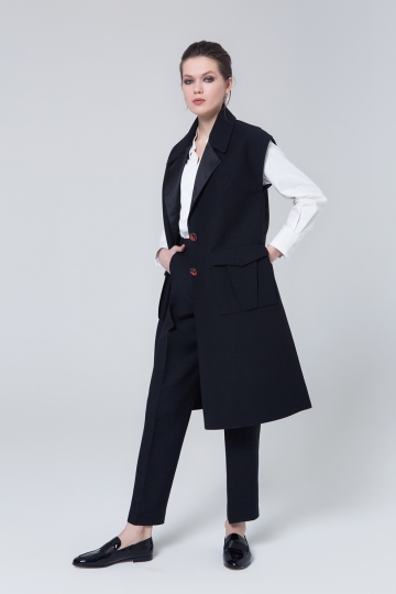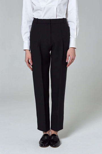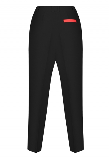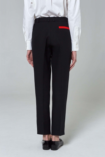Crafted with a luxurious wool blend fabric, these black trousers are a chic choice for smart styling. Finished with a sophisticated pressed crease front with bright red accent on rear welt pocket, they would pair well with elegant white shirt and contemporary black jacket from our collection.