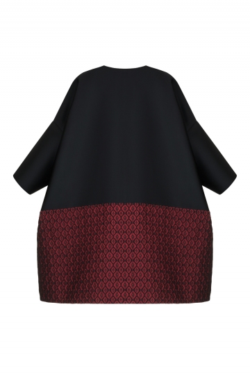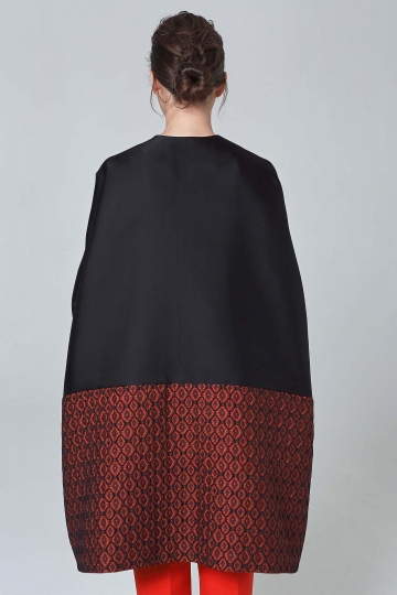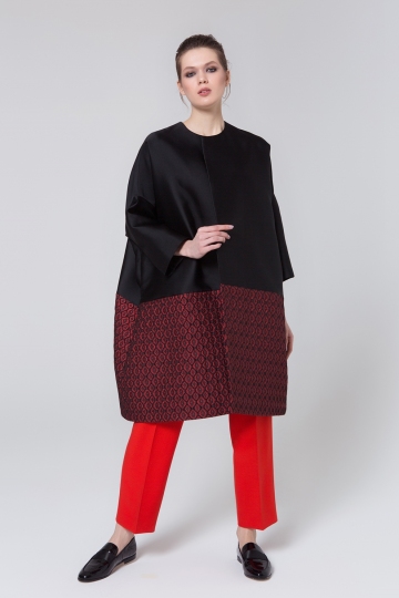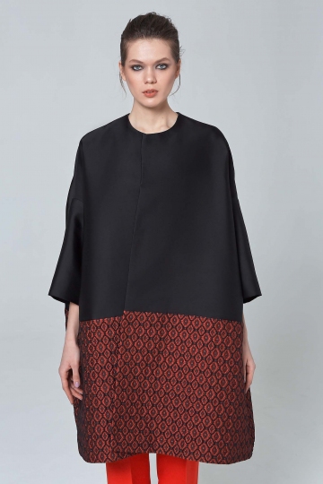 Smartly styled, this fashionable oversize evening coat exudes a chic sophistication. Cut with a collarless neckline, the elegant design will make an ideal addition your outerwear edit. Vibrant geometrical jacquard pattern only adds a dose of opulence. And hidden clasps once again prove the truth – “less is more”.