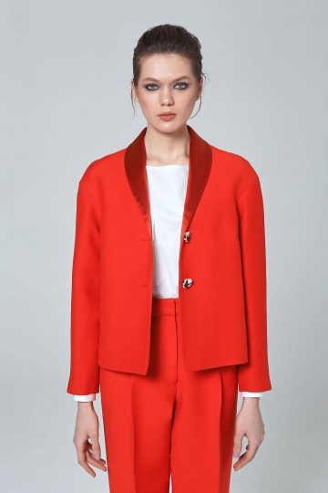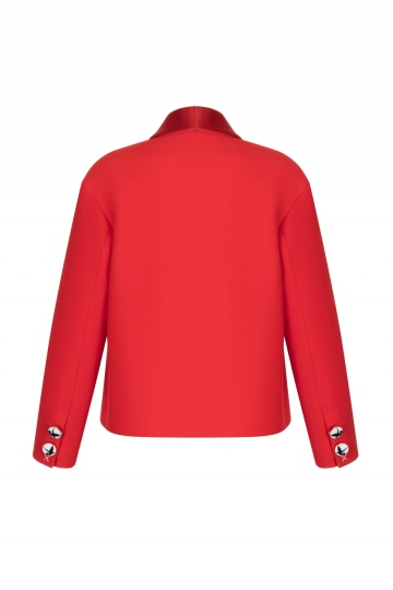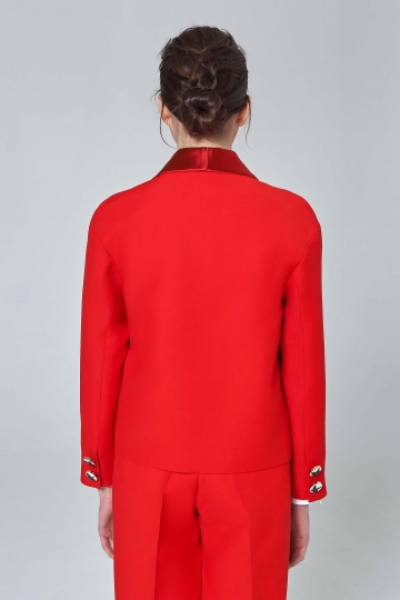 A luxurious layer for smart occasions, this jacket will steer your outfit in a smarter direction. It has been quality-crafted with a wool blend and features a contemporary narrow shawl collar. Classic two-button front fastening and decorated sleeve with exclusive black and white buttons are finishing the scene. Perfect partner to our Japanese-style tunic and red knitted trousers.
