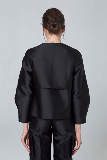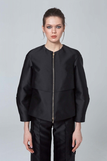 If you want to add some luxury to your top layer, you definitely need to put an eye on a classy black jacket from our collection. Made from dense form-stable fabric interspersed with lurex, it is emanating a gentle sheen and will not let you stay unnoticed. Illusion of multi-layering and full-length front zipper accompanied by original version of ¾ balloon sleeve brings futuristic accents to your must-have jacket. Make perfect set and pair with wide trousers from our collection.