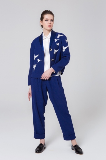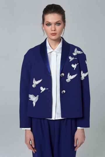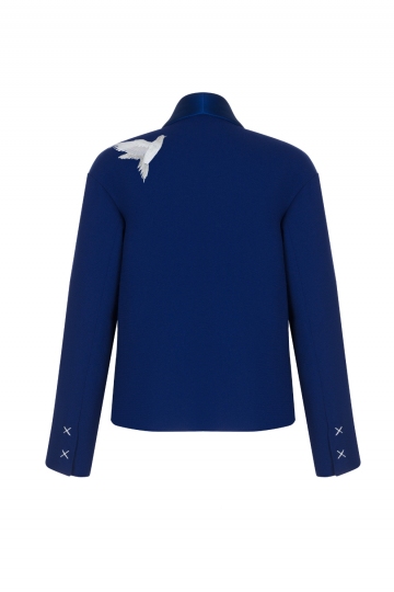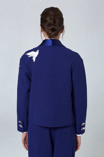 A luxurious layer for smart occasions, this royal blue jacket will steer your outfit in a smarter direction. It has been quality-crafted with a pure wool and features a contemporary narrow shawl collar. Classic two-button front fastening with exclusive black and white buttons and application of embroidered birds are finishing the scene and filling with vibes of high-flight. Perfect match to our royal blue trousers.