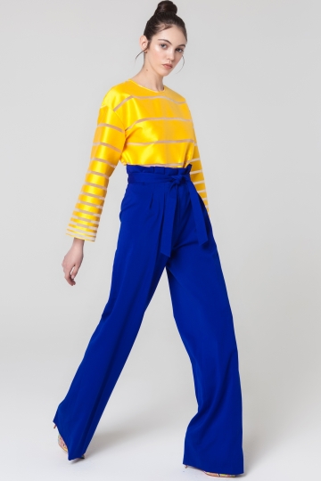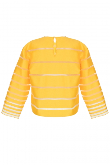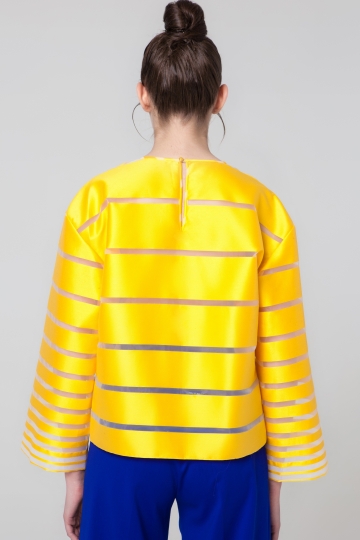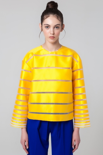 Korsun's long-sleeve blouse is crafted from bright yellow-striped organza fabric. It is designed to give an oversize silhouette.