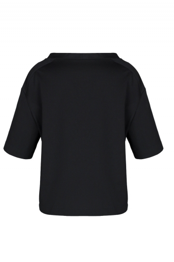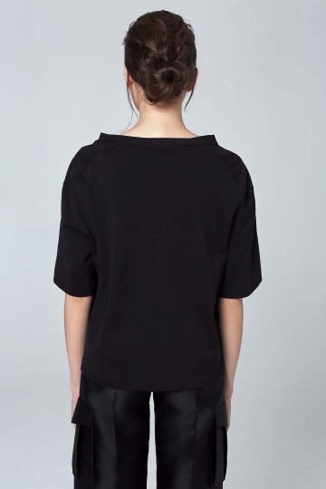 Luxuriously soft and comfortable, the slouchy T-shirt from our collection is an effortless piece to wear through the day and into the night. Crafted in 100% cotton, the oversized silhouette features a wide round neckline and extended shoulder line. Stylish bird swarm print is a distinguishing sign of the high-flying inspirations for collection. It would match with wide leg black trousers designed by us.