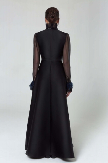 Made for the very special occasions, this luxurious floor-length black dress is a bold refresh on a classic feminine hourglass silhouette. Made of silk blended material, this dress will emphasize your high status. Long transparent sleeves aristocratically drop into bohemian feather cuffs while a Victoriana-inspired high ruff collar is exuding laid-back glamour. Hidden zipper delicately accentuate the line of your back.