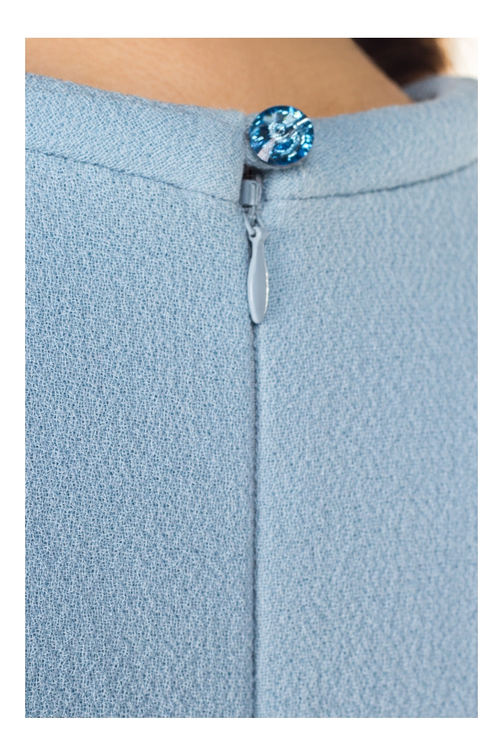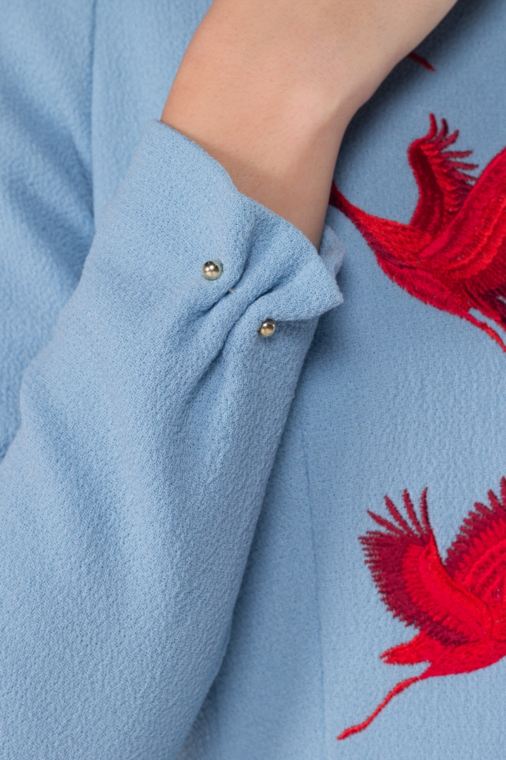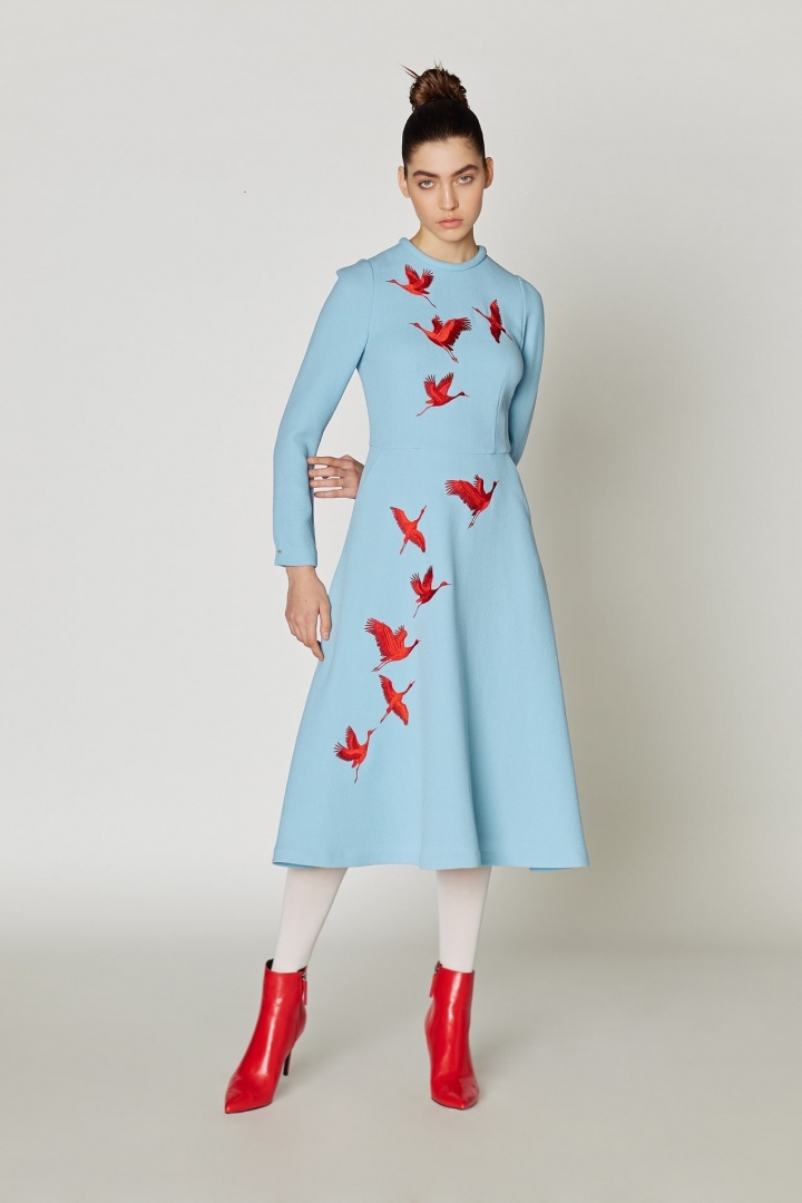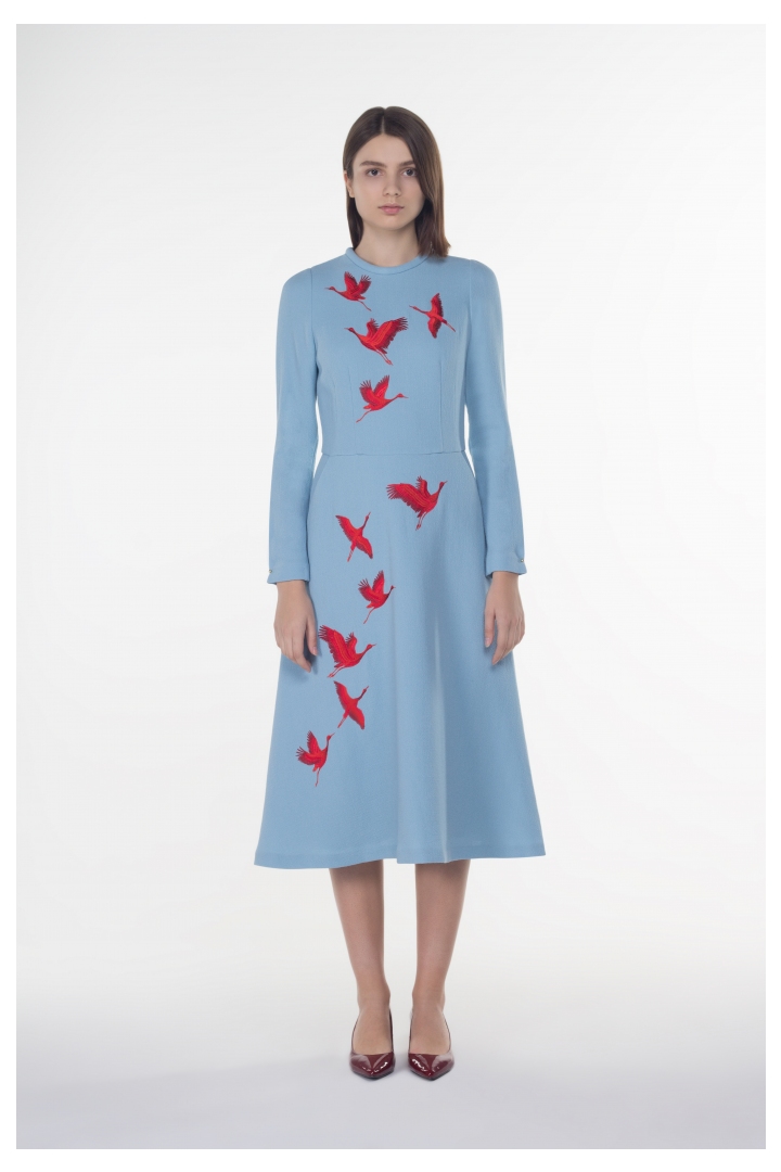 Sky blue midi length dress is the trend of the fall-winter 2018/2019 season. Catchy red cranes, which are used for embroidery 80 000 stitches of German, silk thread, talks about the courage and originality of the owner of the dress. For convenient comfort in the sock, every detail was thought out, so despite 100% wool in the composition, the lining is made of natural luxury silk. Beauty and comfort are the motto in the cold season.