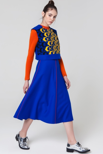Wool drop-waist top for a streamlined silhouette, with front macramé detailing.