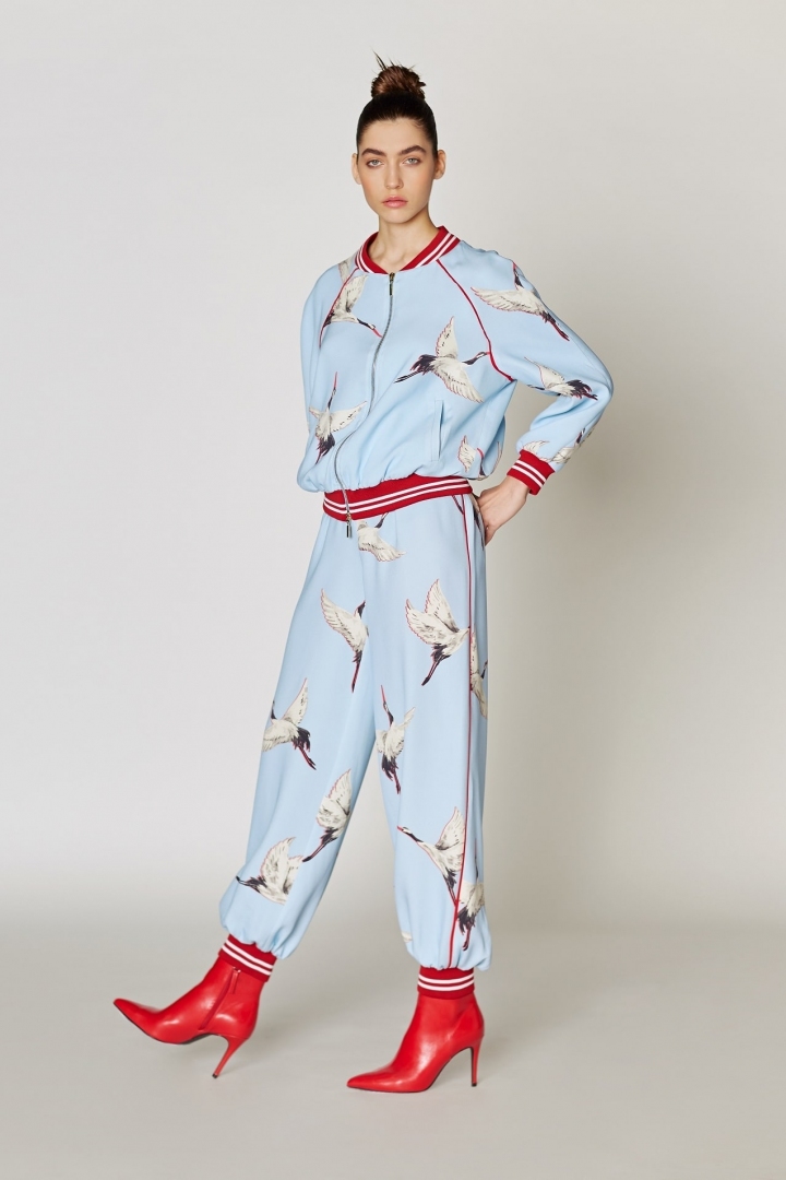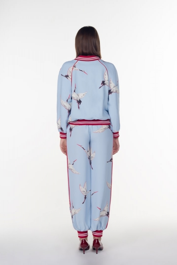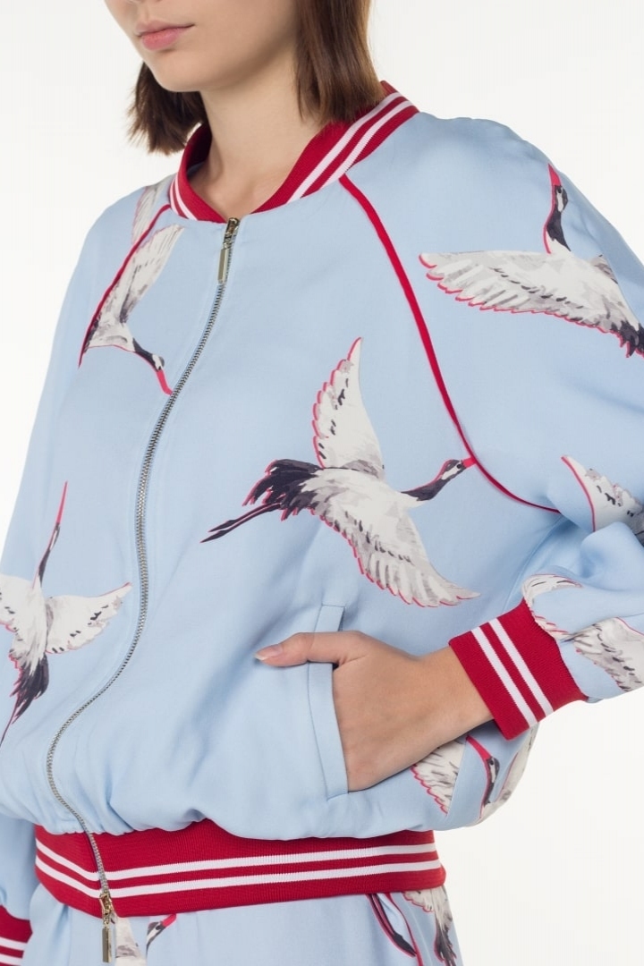 The bomber jacket has burst into the fashion scene boldly and confidently, managing to catch the attention of fashion gurus and become the absolute hit of the fall-winter 2018 season. In the 1930s, such jackets were made exclusively for men and were included as a mandatory element of pilot’s clothing. Today, a bomber jacket is a number one pick for every fashionista. In luxury blue silk with a print of gliding cranes, this line will add femininity and independence to your look.
