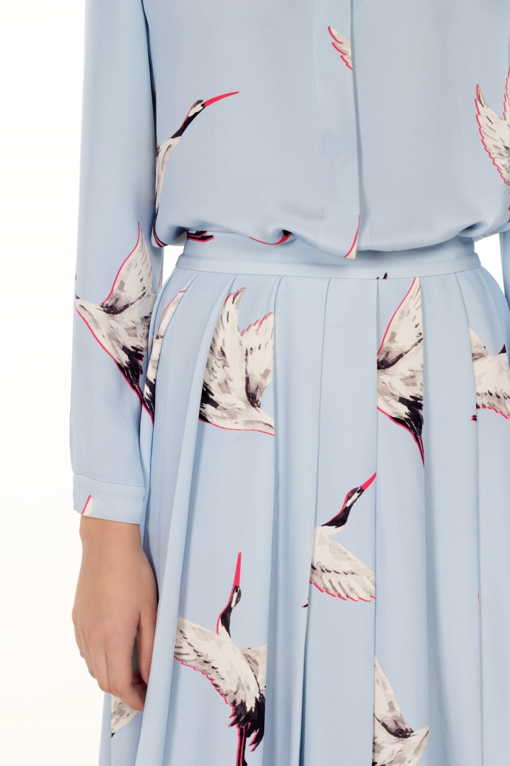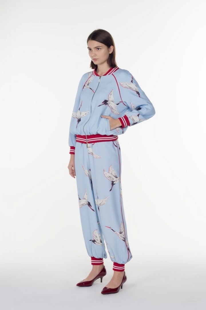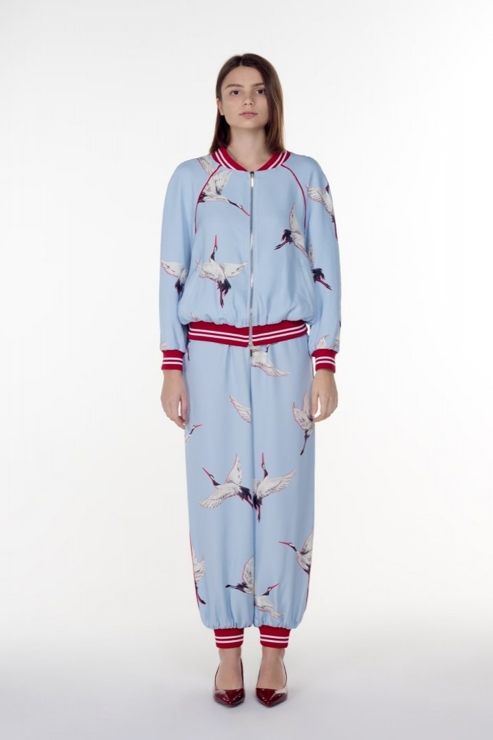 Beautiful, stylish and comfortable are the three criteria that are crucial elements for any modern woman. Baggy Turkish pants are an ideal solution to all problems. An oriental cut style makes a woman elegant and mysterious. With free tailoring the pants ennobles and accentuates the female form. Idiosyncratic printed cranes in combination with luxury blue silk bring vivid impressions not only to the wearer, but to those around her as well.