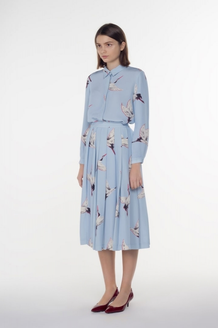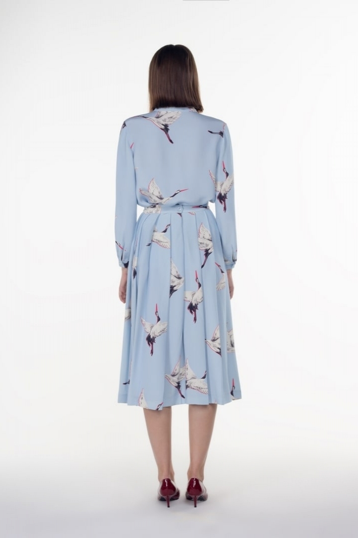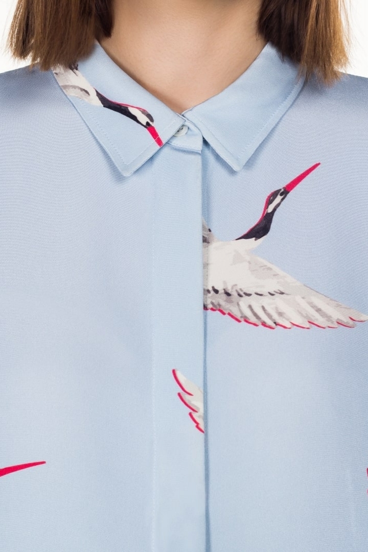 Fashion standards for fall 2018 have dramatically changed with emblematic colors such as khaki or taupe being displaced by light-blue. Katrine KORSUN has developed a unique silk blouse headlining crane motifs which appear to float in the sky-blue silk, adding to the tenderness and ethereal of this piece. A combination of the trendiest palette of this season and an incredibly delicate print will impact on your wardrobe with a fresh essence.