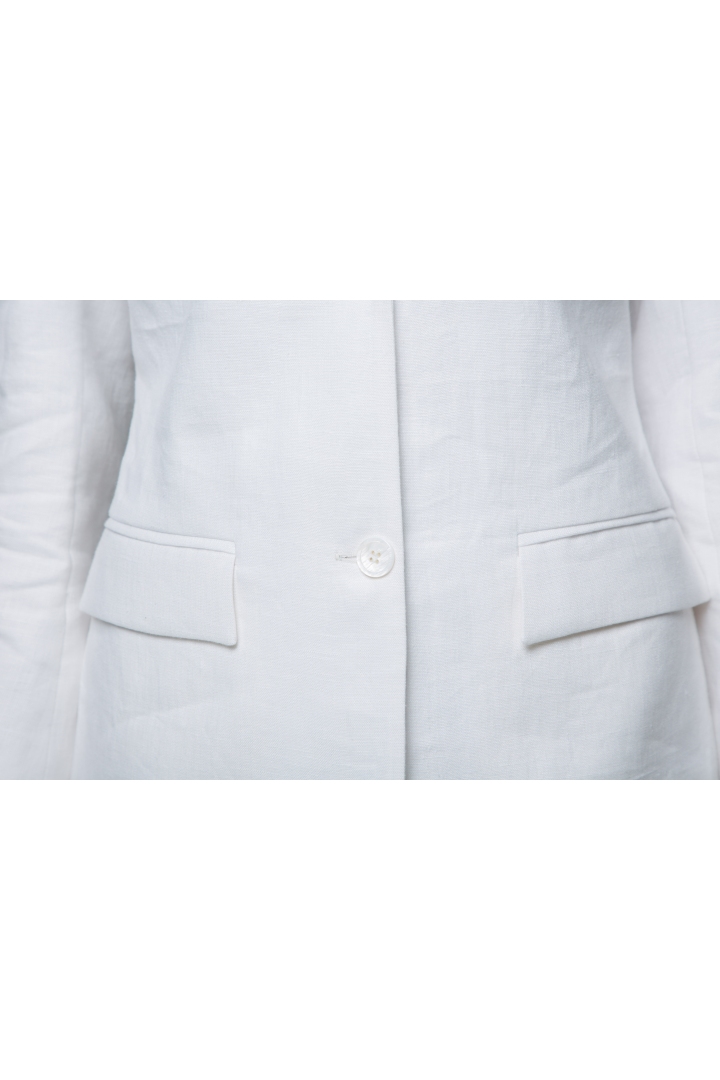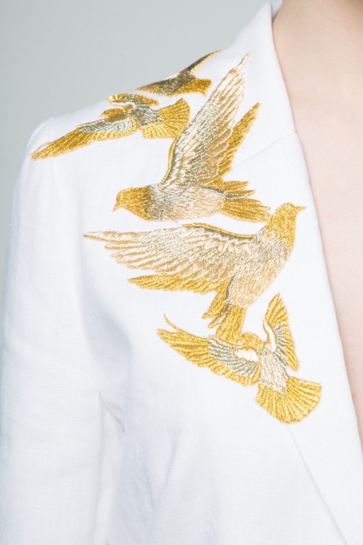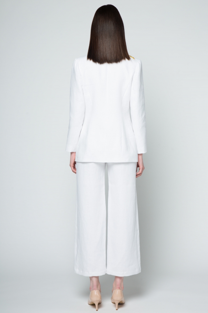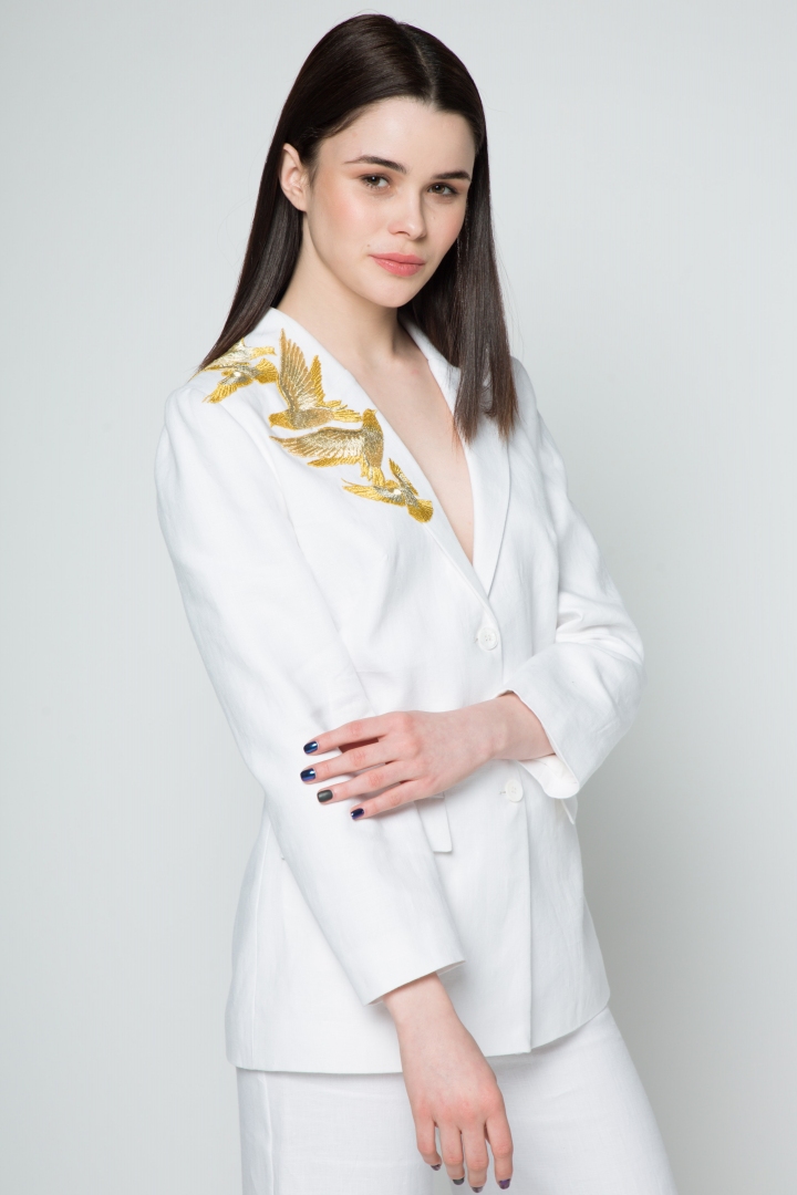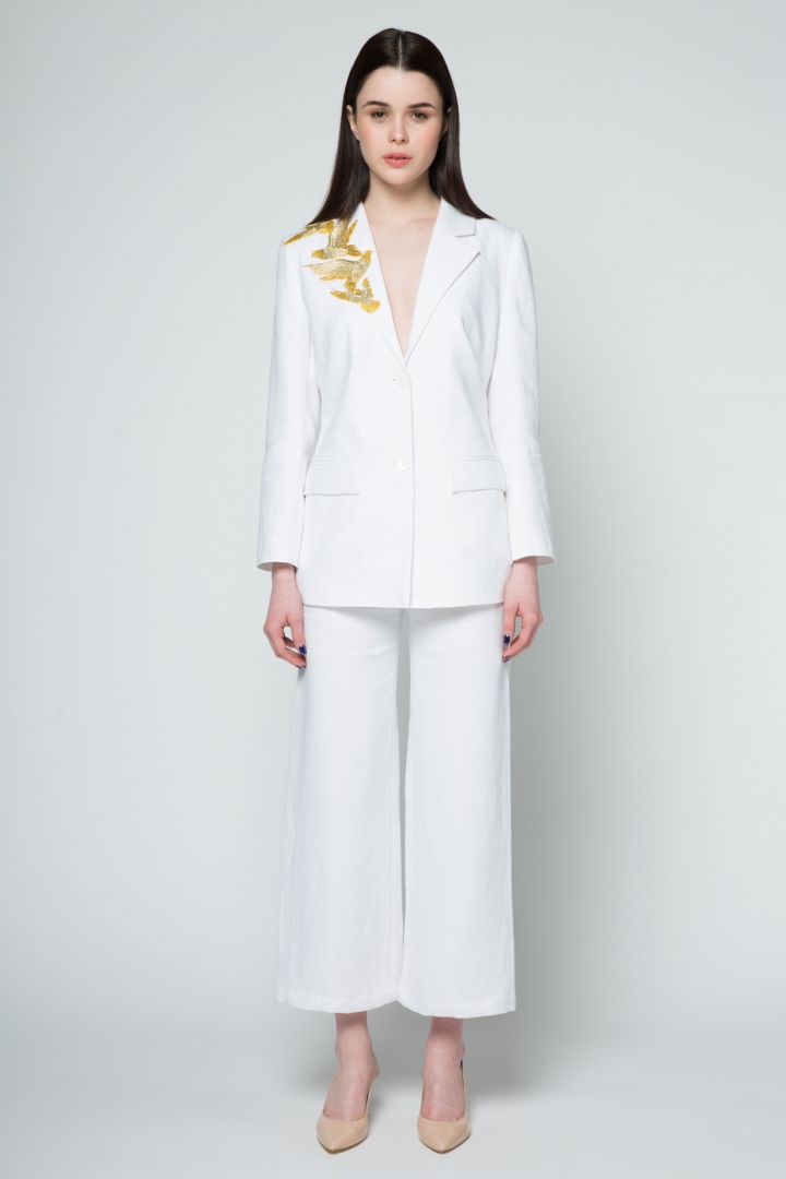 White features as one of the preeminent colours of the new season, prominent in all New York, London, Milan and Paris lookbooks. That is why the new Katrine KORSUN collection leads with a snow-white suit. A long white jacket embroidered with golden birds in 100% linen. Luxurious silk lining makes the product fabulously comfortable to wear.