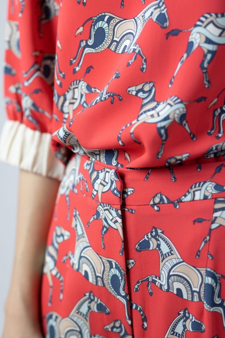 Wide red trousers with the print of the Andalusian gallopers are going to tell for themselves about the stylish characteristic and about the bravery. The clothing item is 100% out of thick silk, has free cutting and stylish design. Given model successfully will add to any look and will present to its owner many compliments.