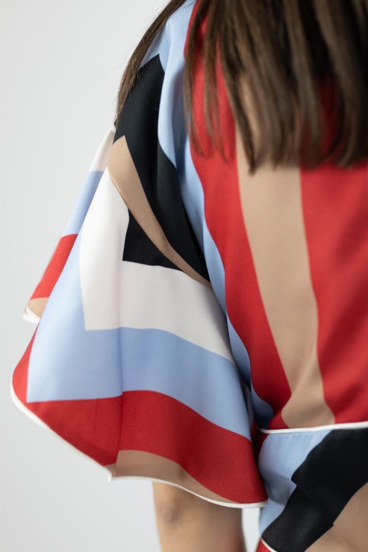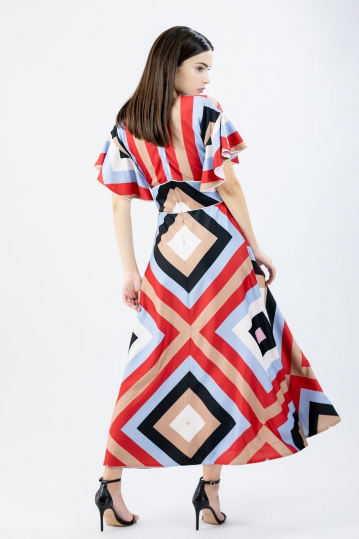 The bright dress with a maximum length as well as with geometrical print is made for brave and unordinary women, that love to be in the centre of attention. The Geometrics on the dress, structure the figure and underlines the skinniness of it, and as for 100% silk lining of the clothing item, presents comfort and confidence.