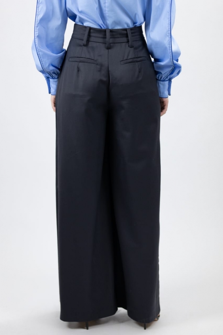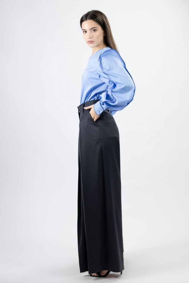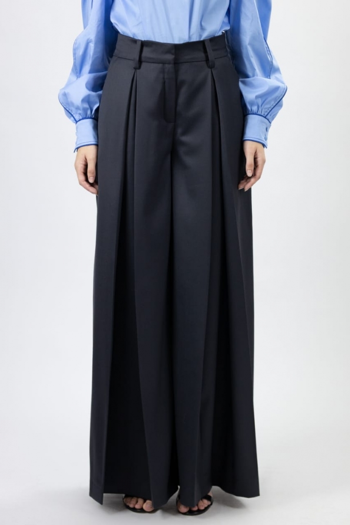 Wide trousers in style of Marlene Dietrich in the colour graphite black without a doubt are always going to be in trend. Stylish design, the style of the cutting underlines waistline, 100% wool in the consistency of the model, will make the look sophisticated. Given model is the cheery of the collection.