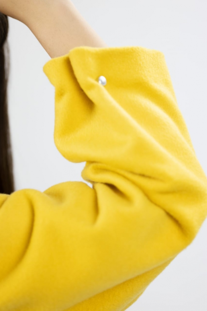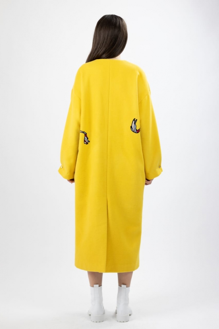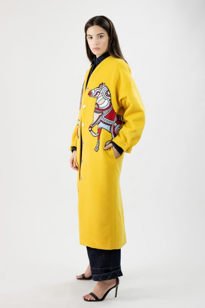 The bright yellow coat is 100% cashmere and will make your look stylish and contrasting. Thanks to signature application of Andalusian horses and to the unique design, the coat on you will grab everyone’s attention. The high quality of material and successfully picked out Italian production make this model the hit of the season in Fall/Winter 2019-20.