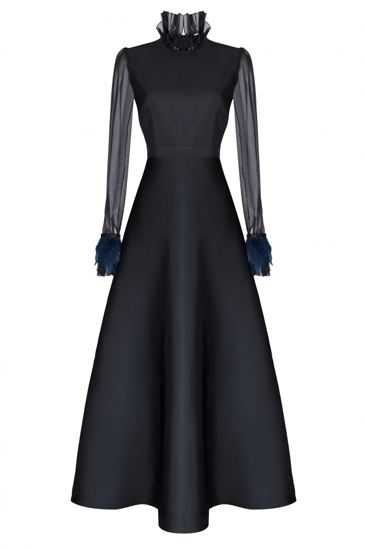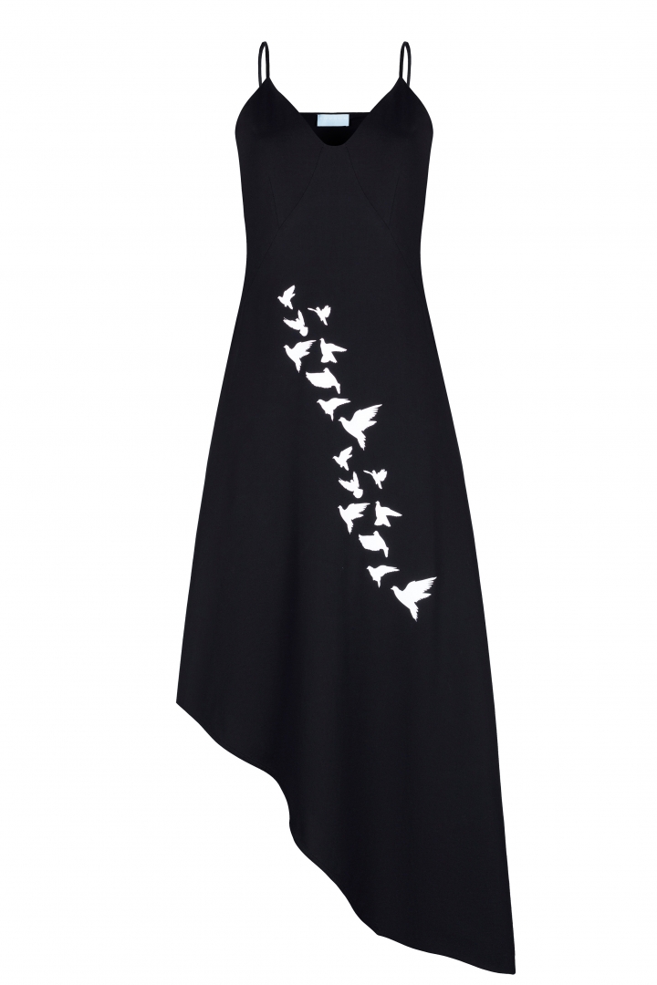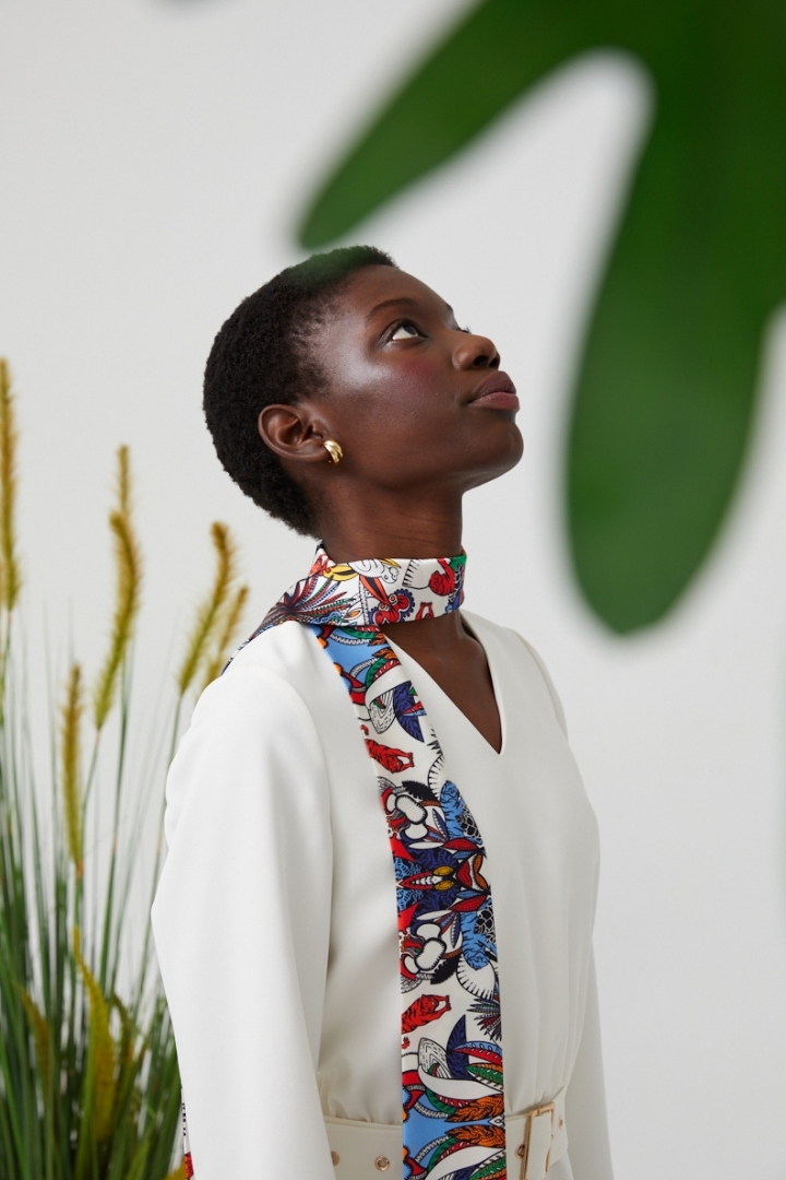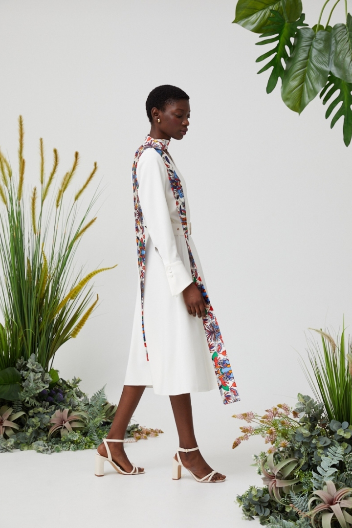 The white, silk dress with the midi length undoubtedly is part of the trend o the year 2021. Free model with the V-neckline and bright printed accent on the neck. The natural 100% silk, high quality findings and luxury sewing make this dress irreplaceable thing in the wardrobe.