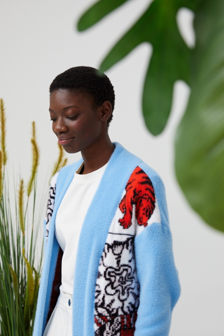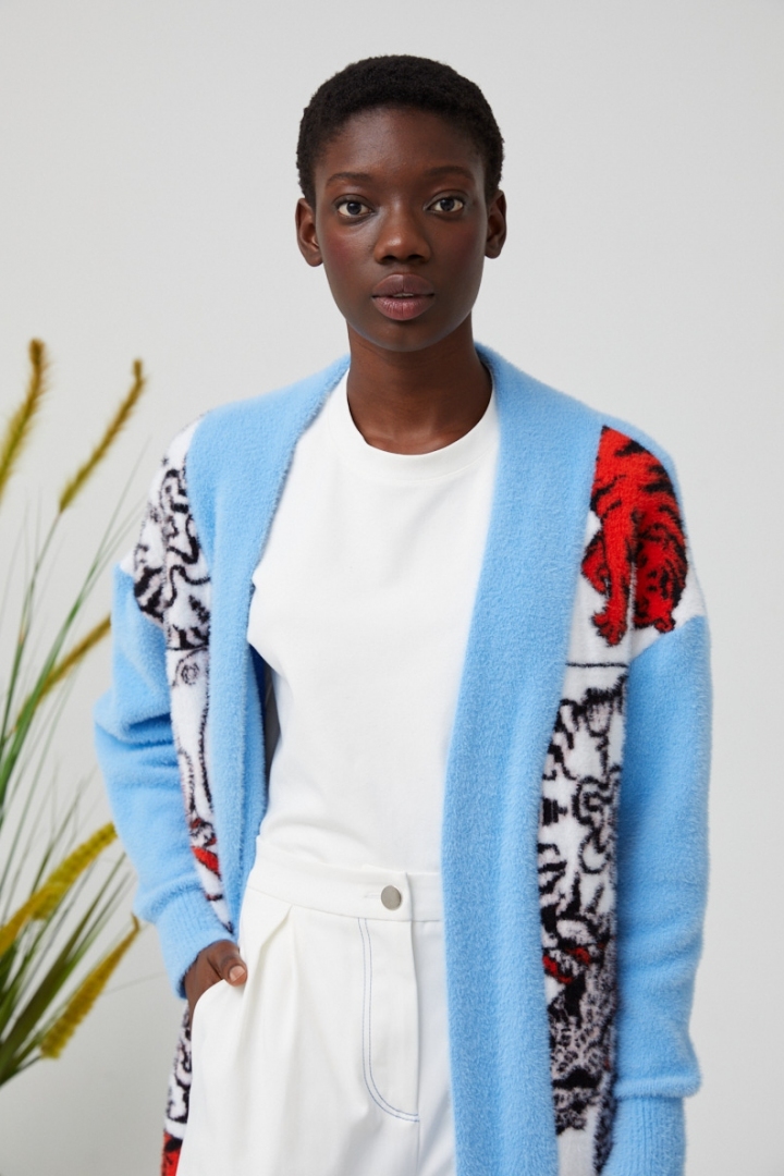 The bright blue cardigan with non less contrasting habitats of the jungle will make your look brave and daring. Luxury quality, amazing match and juicy colours make this model trendy. The cardigan on buttons will warm you during cold nights and will successfully complete any look.