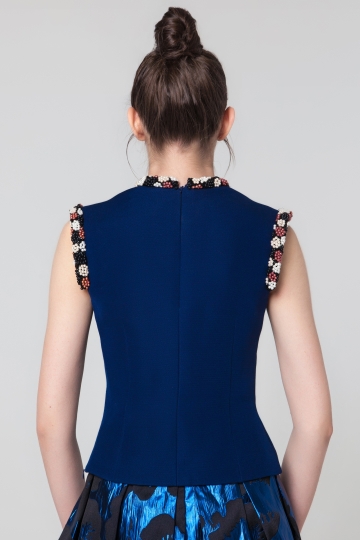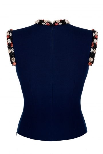 Fitted sleeveless top, with zip fastening at the back and round-neck cut-out detailing. Both the neck and sleeve edges are accented with bead-covered detailing, which gives it a festive feel.