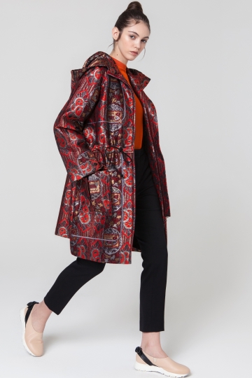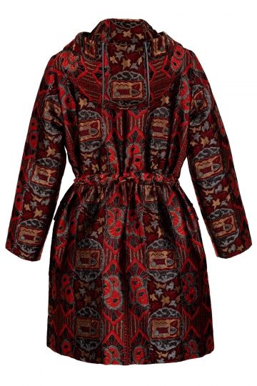 This parka is cut from jacquard fabric and decorated with a satin trim. It's filled wool padding, and has a hood for added warmth. Use the drawstring tie to accent your waist. It's sure to keep you warm on a chilly day. Looks best worn with flared pants or jeans.