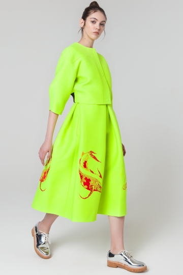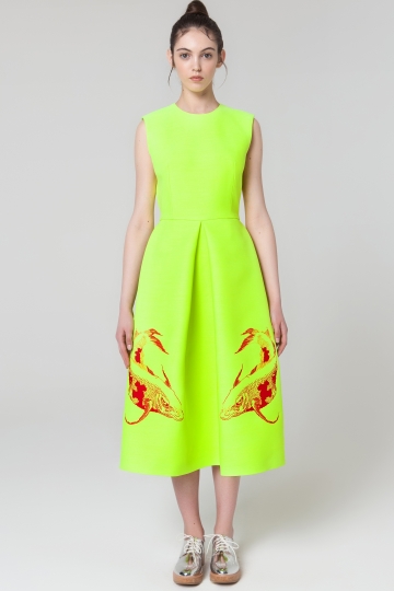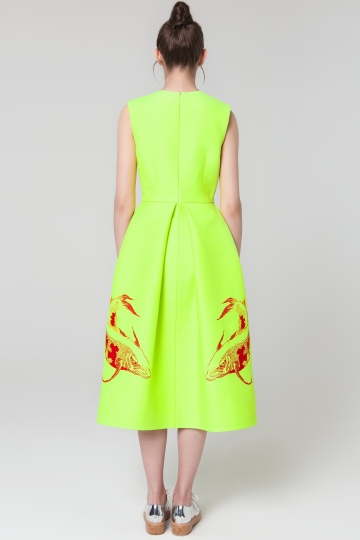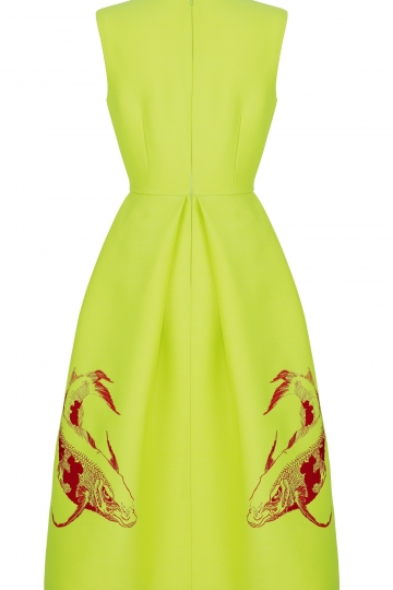 Smooth wool dress with elegant “Fish” embroidery on the front and back of the skirt. The dress is round-neck and sleeveless and has been tailored at the waist. The central fold of the skirt flares to give an hourglass silhouette.