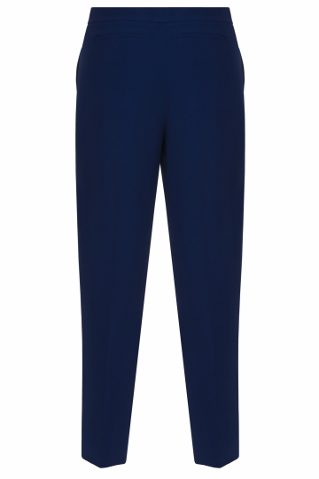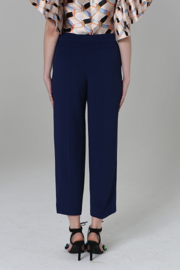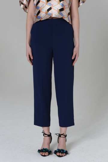 The straight-legged dark plue pants are made completely out of viscose. The leg falls just short of your ankles, which suggests some high heels and a blouse done in matching colors.