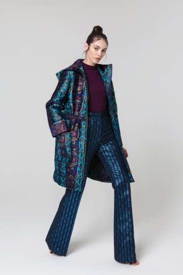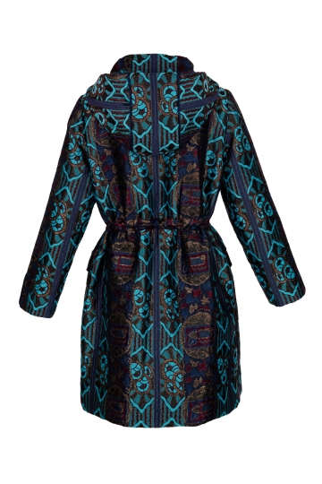 This parka is cut from jacquard fabric and decorated with a satin trim. It's filled wool padding, and has a hood for added warmth. Use the drawstring tie to accent your waist. It's sure to keep you warm on a chilly day. Looks best worn with flared pants or jeans.