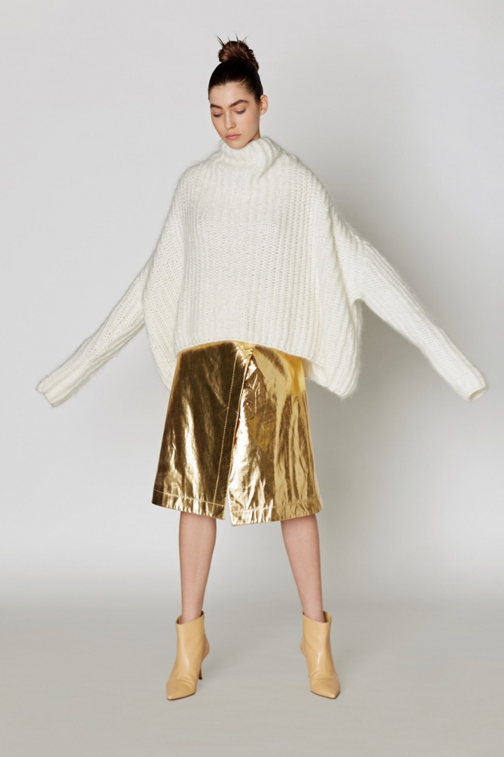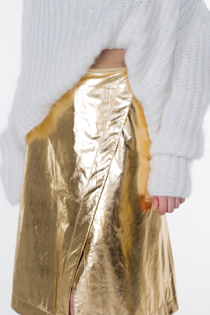 En la paleta de colores de moda, el color dorado sigue siendo el líder indiscutible. La forma trapecial de la falda resalta favorablemente el valor de la figura femenina, haciendo que la silueta sea elegante. El dorado metálico agrega originalidad y lujo a su dueña. La singularidad de este modelo consiste en su composición: 50% de poliéster, 50% de poliuretano, la parte interior está hecha 100% de lana. ¡Mantenerse hermosa y cálida es posible! Con esta falda será la leona principal en cualquier compañía.