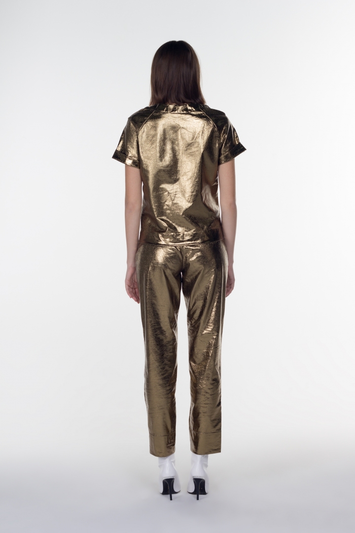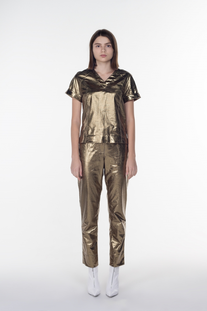 La pasarela de moda dicta las reglas cada temporada. Las tendencias están cambiando, pero un clásico de lujo solo cambia la forma de su presentación. Los pantalones en color dorado oscuro llamarán su atención. El refinado color dorado fue transformado por la nobleza. El tono único convierte instantáneamente a una personalidad brillante en una verdadera reina. El 50% de algodón los hace extremadamente cómodos de llevar. La colección tiene en stock el mismo top original.