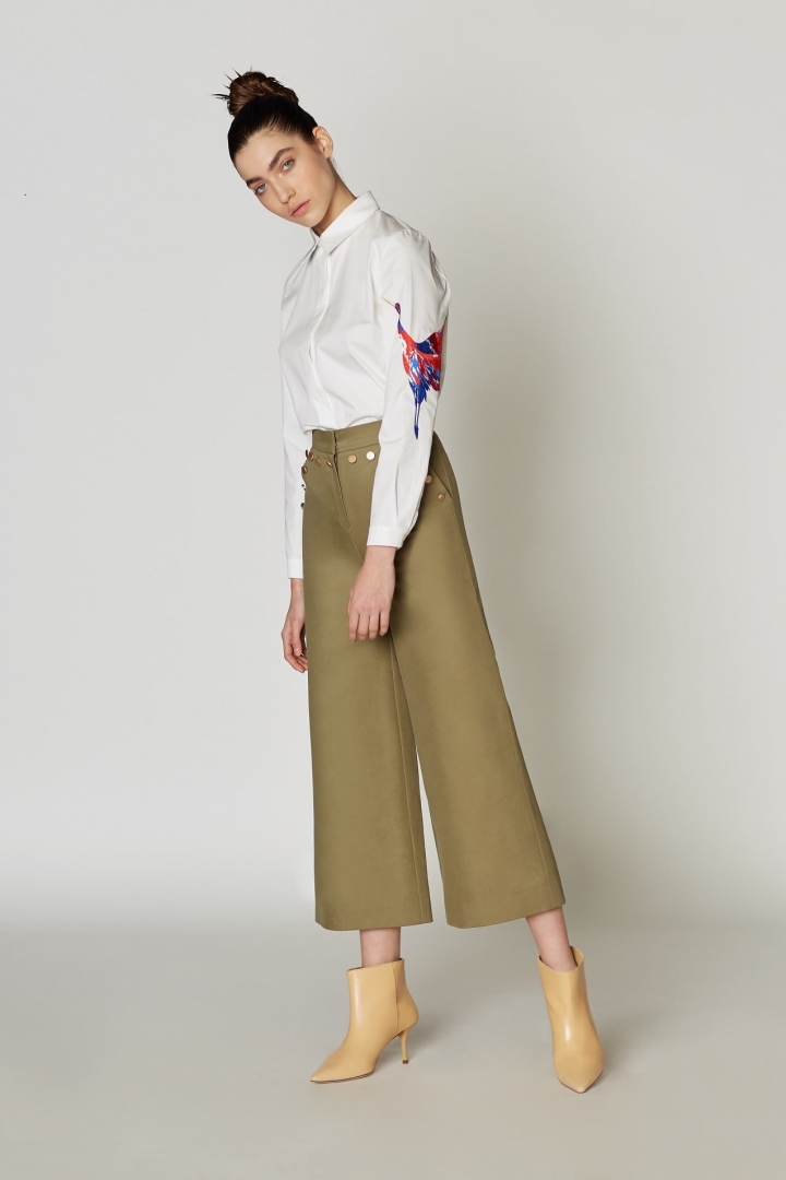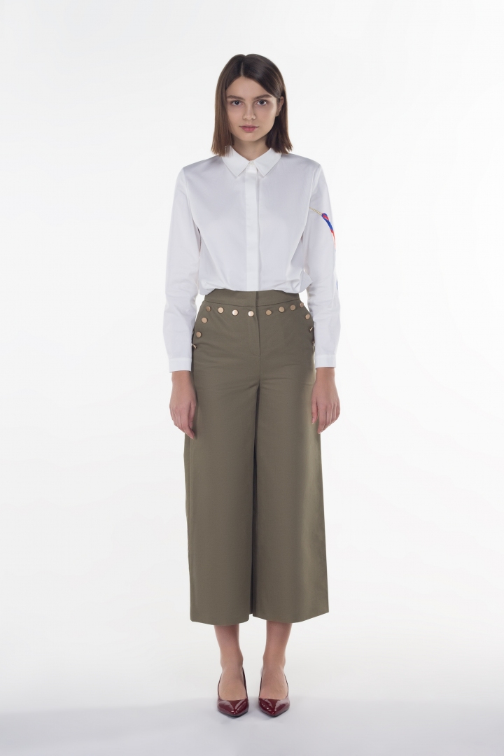 Los pantalones culotes causarán impacto en la tendencia de la temporada 2018-2019. El corte libre que fluye ocultará todos los defectos de la figura, la hará más elegante. Los culotes son la solución universal para los fanáticos de la moda. Favorecen a mujeres con formas diferentes. El color caqui dará la imagen perfecta para el estilo casual elegante. En combinación con una parte superior brillante, los pantalones conseguirán un atractivo aún más moderno.
