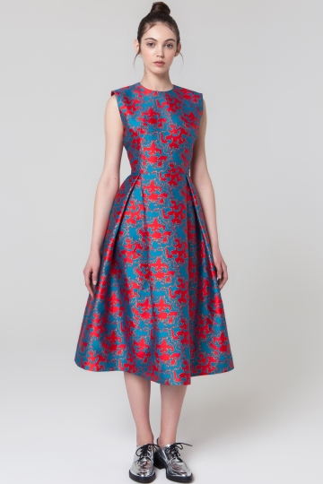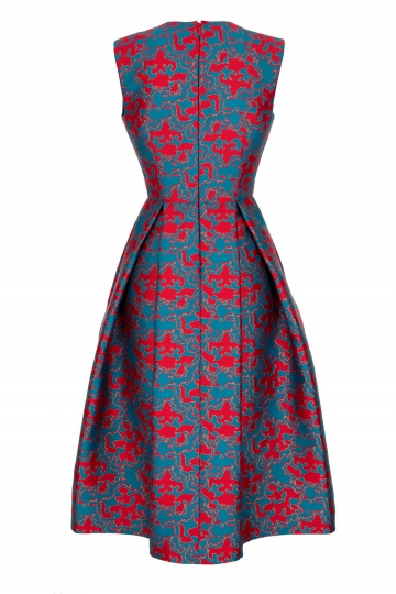 Платье Корсун с круглой шеей без рукавов, выполненное из яркой жаккардовой ткани, зауженное в талии.