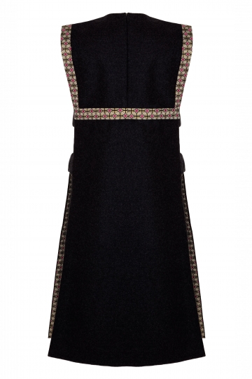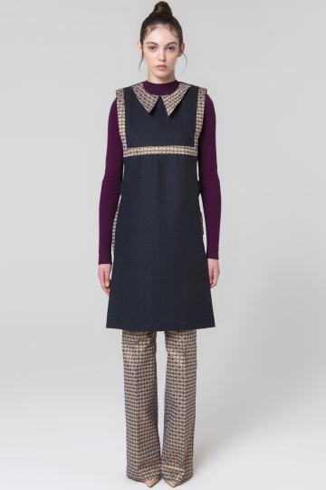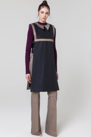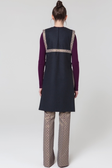 Платье-жилетка без боковых швов, сделанная из гладкой шерсти и украшенная жаккардовой тканью. Вы можете надеть его со свитером вместе с жаккардовыми облегающими брюками, идеально подходящие для осенне-зимнего гардероба.