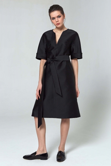 Платье выполнено из качественного материала, способного держать форму. Неглубокий V-образный вырез выгодно подчеркивает зону декольте, а пояс - талию и расширенный к низу силуэт. Отлично сочетается с любым стильным пальто из нашей коллекции и лоферами в качестве простого и стильного вечернего наряда.