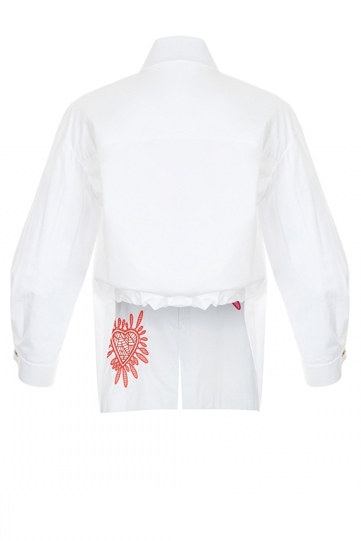 Долой скучные рубашки для офиса! Стилизируйте искусные образы вместе с нашей сорочкой с вышитыми деталями, отсылающими к живописным полотнам Мерседес Лагунас. Модель выполнена с классическим воротником и с ассиметричной линией кроя: удлиненная спереди и завершивающаяся на линии талии сзади. Эта блуза создана из дышащего хлопка, чтобы украсить рабочую рутину. Если после трудового дня планируется вечеринка, дополните образ шелковой юбкой в оттенке сапфир.