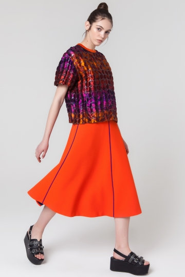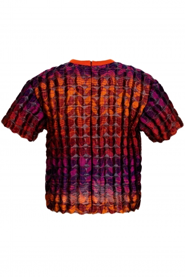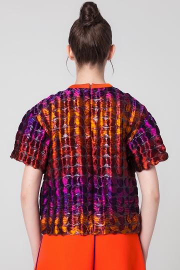 Блузка с круглой шеей, выполненная из органзы оранжево-фиолетового цвета, с свободно спадающим силуэтом оверсайз. Короткие рукава с невидимой молнией на задней стороне.