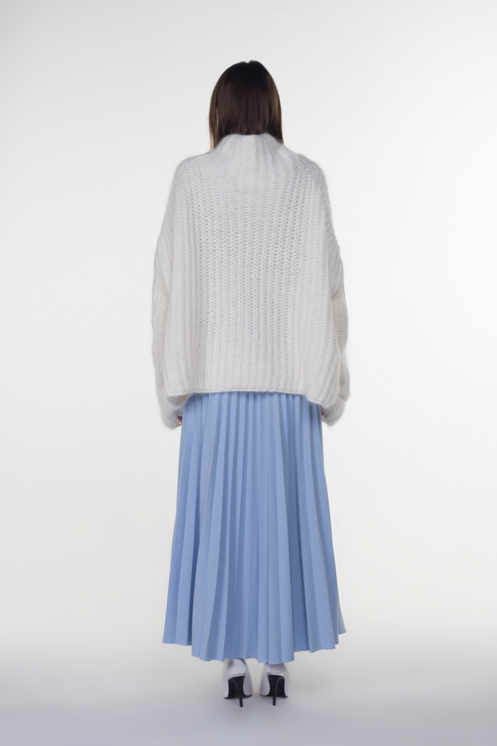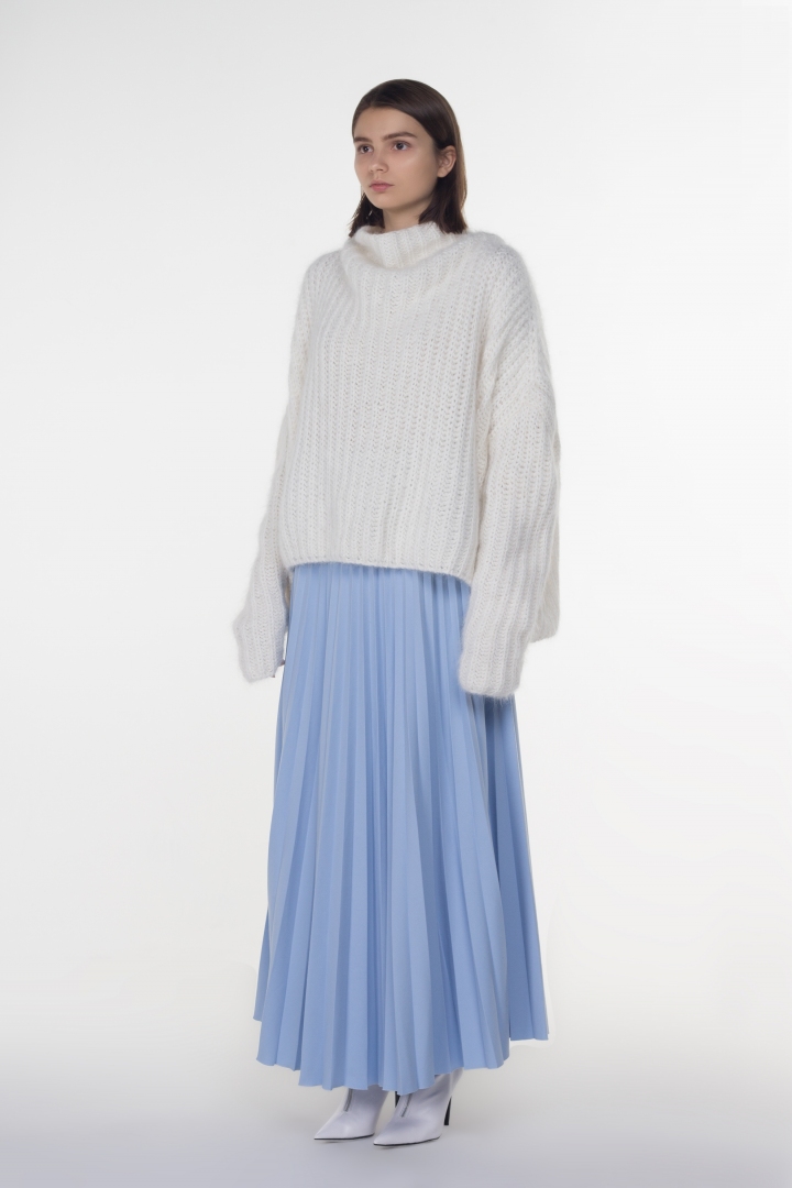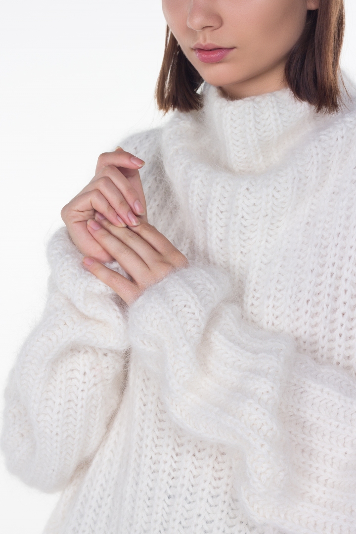 Во все времена внимание мужчин завоёвывала женская хрупкость. Именно для этой миссии был создан невероятный свитер оверсайз. Благодаря своим просторным формам женщина приобретает ту самую хрупкость и таинственность. Особенно приятный бонус изделия заключается в его составе. Выполненный из 100% шерсти альпаки, свитер не только очень тёплый, но и мягкий на ощупь, не колется. Для современной женщины комфорт играет далеко не последнюю роль.