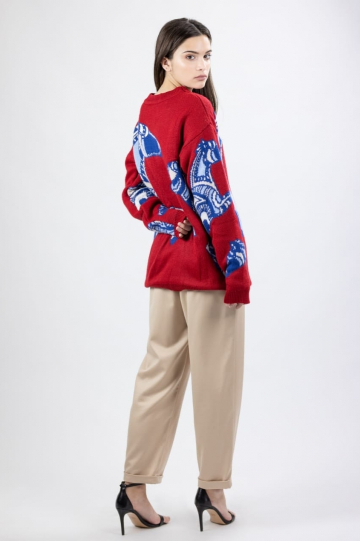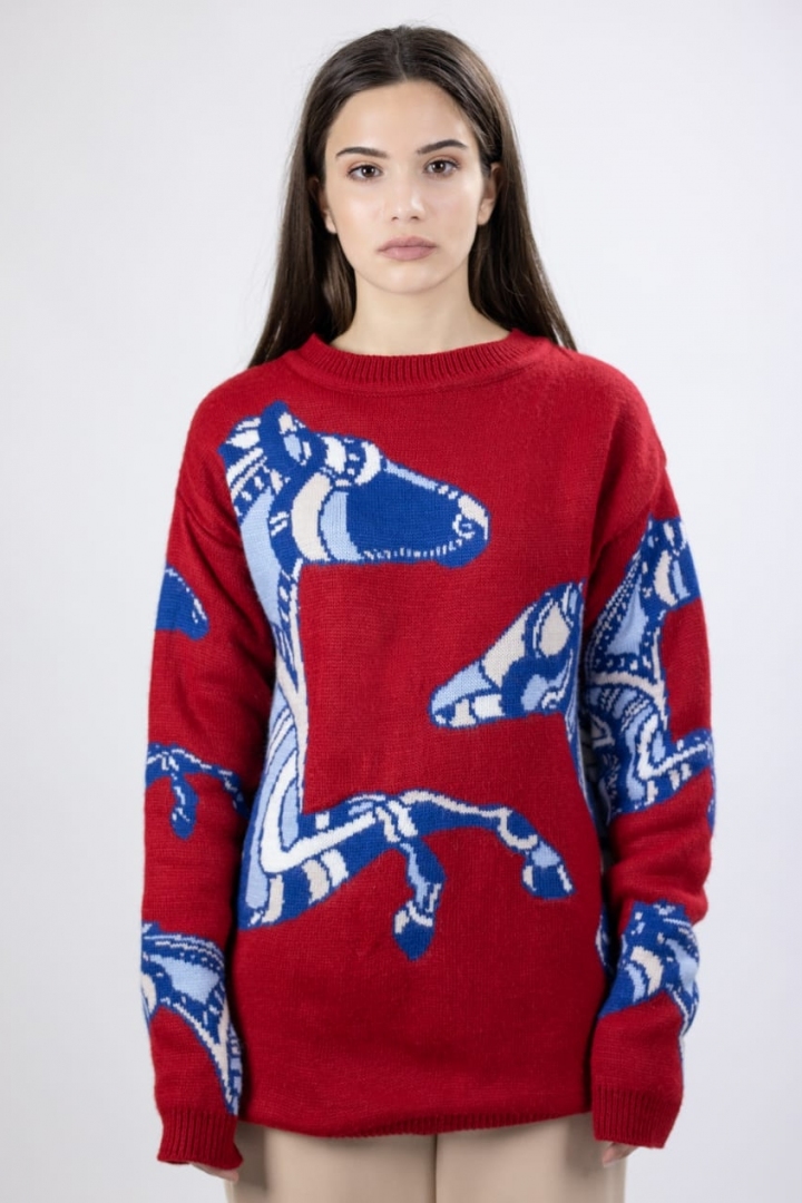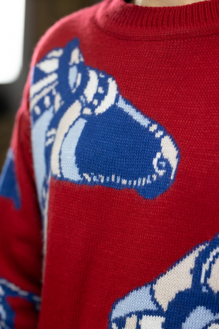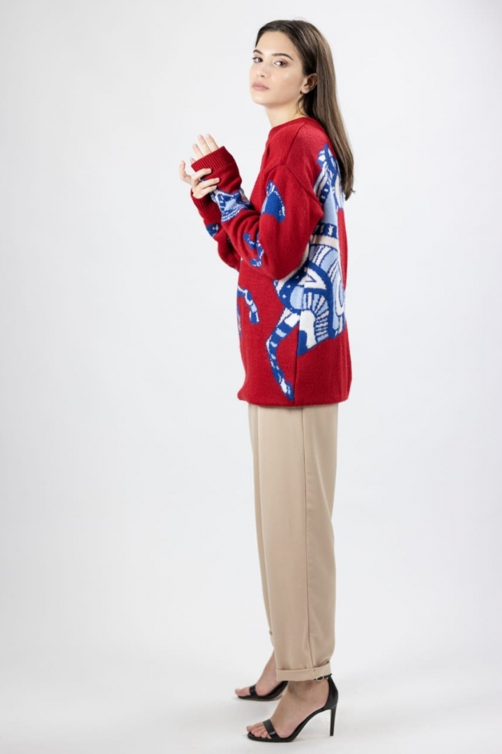 Яркий красный свитер с не менее контрастными андалузскими лошадьми сделает ваш образ смелым и дерзким. Люксовое качество, превосходное сочетание и насыщенность цветов делают эту модель запоминающейся и трендовой. По-домашнему уютный и тёплый свитер станет лучшим другом в холодную пору года.
